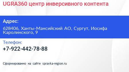 UGRA360, центр инверсивного контента по адресу 628406, Ханты-Мансийский АО, Сургут, Иосифа Каролинского, 9 в дальнейшем Организация, размещена в следующих категориях: