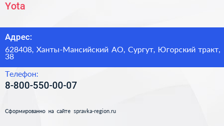 Yota по адресу 628408, Ханты-Мансийский АО, Сургут, Югорский тракт, 38 в дальнейшем Организация, размещена в следующих категориях: