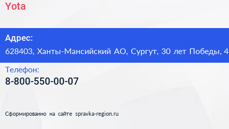 Yota по адресу 628403, Ханты-Мансийский АО, Сургут, 30 лет Победы, 46 в дальнейшем Организация, размещена в следующих категориях: