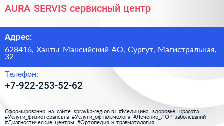 AURA SERVIS, сервисный центр по адресу 628416, Ханты-Мансийский АО, Сургут, Магистральная, 32 в дальнейшем Организация, размещена в следующих категориях: