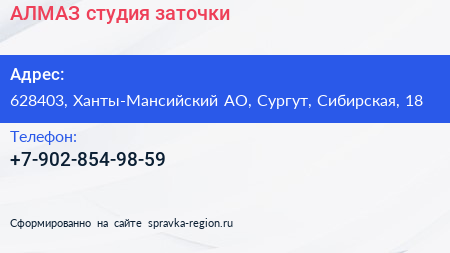 АЛМАЗ, студия заточки по адресу 628403, Ханты-Мансийский АО, Сургут, Сибирская, 18 в дальнейшем Организация, размещена в следующих категориях: