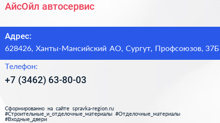 АйсОйл, автосервис по адресу 628426, Ханты-Мансийский АО, Сургут, Профсоюзов, 37Б в дальнейшем Организация, размещена в следующих категориях: