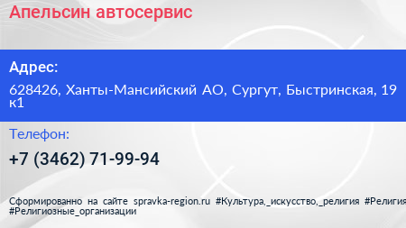 Апельсин, автосервис по адресу 628426, Ханты-Мансийский АО, Сургут, Быстринская, 19 к1 в дальнейшем Организация, размещена в следующих категориях: