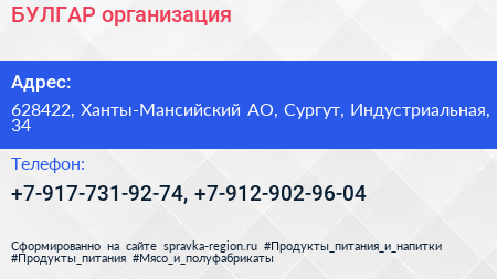 БУЛГАР, организация по адресу 628422, Ханты-Мансийский АО, Сургут, Индустриальная, 34 в дальнейшем Организация, размещена в следующих категориях: