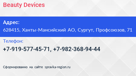 Beauty Devices по адресу 628415, Ханты-Мансийский АО, Сургут, Профсоюзов, 71 в дальнейшем Организация, размещена в следующих категориях: