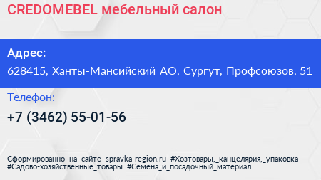 CREDOMEBEL, мебельный салон по адресу 628415, Ханты-Мансийский АО, Сургут, Профсоюзов, 51 в дальнейшем Организация, размещена в следующих категориях: