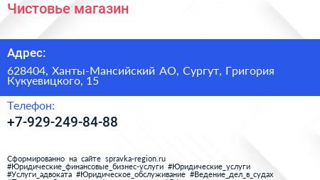 Чистовье, магазин по адресу 628404, Ханты-Мансийский АО, Сургут, Григория Кукуевицкого, 15 в дальнейшем Организация, размещена в следующих категориях: