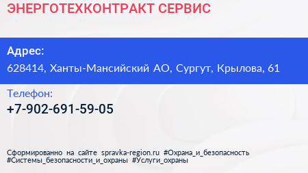 ЭНЕРГОТЕХКОНТРАКТ-СЕРВИС по адресу 628414, Ханты-Мансийский АО, Сургут, Крылова, 61 в дальнейшем Организация, размещена в следующих категориях: