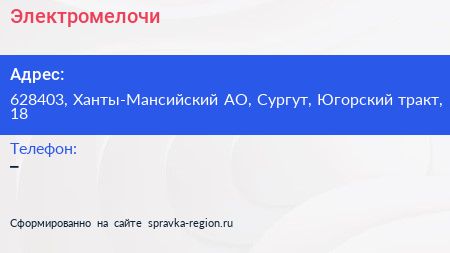 Электромелочи по адресу 628403, Ханты-Мансийский АО, Сургут, Югорский тракт, 18 в дальнейшем Организация, размещена в следующих категориях: