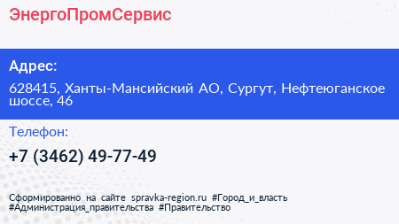 ЭнергоПромСервис по адресу 628415, Ханты-Мансийский АО, Сургут, Нефтеюганское шоссе, 46 в дальнейшем Организация, размещена в следующих категориях:
