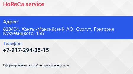 HoReCa service по адресу 628404, Ханты-Мансийский АО, Сургут, Григория Кукуевицкого, 15Б в дальнейшем Организация, размещена в следующих категориях: