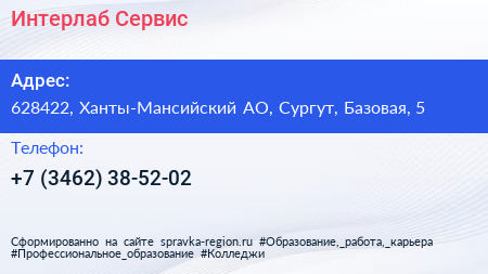 Интерлаб-Сервис по адресу 628422, Ханты-Мансийский АО, Сургут, Базовая, 5 в дальнейшем Организация, размещена в следующих категориях: