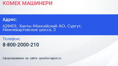 КОМЕК МАШИНЕРИ по адресу 628401, Ханты-Мансийский АО, Сургут, Нижневартовское шоссе, 3 в дальнейшем Организация, размещена в следующих категориях: