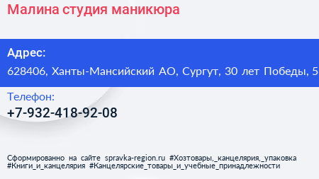 Малина, студия маникюра по адресу 628406, Ханты-Мансийский АО, Сургут, 30 лет Победы, 56 в дальнейшем Организация, размещена в следующих категориях:
