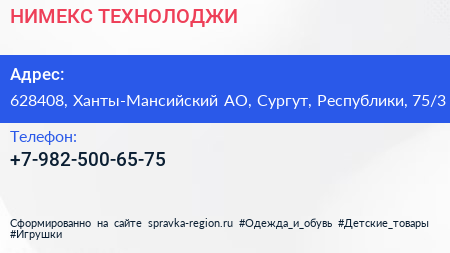 НИМЕКС ТЕХНОЛОДЖИ по адресу 628408, Ханты-Мансийский АО, Сургут, Республики, 75/3 в дальнейшем Организация, размещена в следующих категориях: