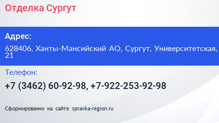 Отделка-Сургут по адресу 628406, Ханты-Мансийский АО, Сургут, Университетская, 21 в дальнейшем Организация, размещена в следующих категориях: