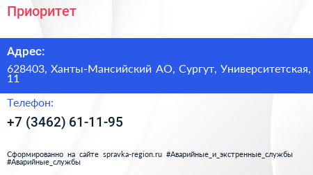 Приоритет по адресу 628403, Ханты-Мансийский АО, Сургут, Университетская, 11 в дальнейшем Организация, размещена в следующих категориях: