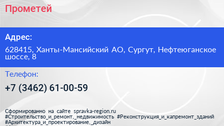 Прометей по адресу 628415, Ханты-Мансийский АО, Сургут, Нефтеюганское шоссе, 8 в дальнейшем Организация, размещена в следующих категориях: