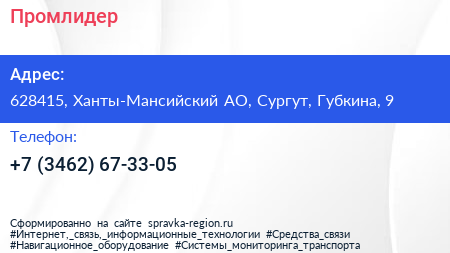 Промлидер по адресу 628415, Ханты-Мансийский АО, Сургут, Губкина, 9 в дальнейшем Организация, размещена в следующих категориях: