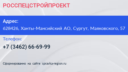 РОССПЕЦСТРОЙПРОЕКТ по адресу 628426, Ханты-Мансийский АО, Сургут, Маяковского, 57 в дальнейшем Организация, размещена в следующих категориях: