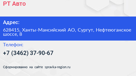 РТ-Авто по адресу 628415, Ханты-Мансийский АО, Сургут, Нефтеюганское шоссе, 8 в дальнейшем Организация, размещена в следующих категориях: