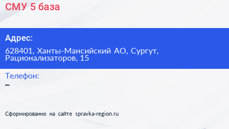 СМУ №5, база по адресу 628401, Ханты-Мансийский АО, Сургут, Рационализаторов, 15 в дальнейшем Организация, размещена в следующих категориях: