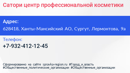 Сатори, центр профессиональной косметики по адресу 628418, Ханты-Мансийский АО, Сургут, Лермонтова, 9а в дальнейшем Организация, размещена в следующих категориях: