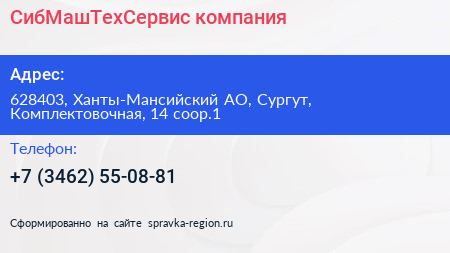 СибМашТехСервис, компания по адресу 628403, Ханты-Мансийский АО, Сургут, Комплектовочная, 14 соор.1 в дальнейшем Организация, размещена в следующих категориях: