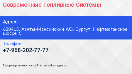 Современные Топливные Системы по адресу 628415, Ханты-Мансийский АО, Сургут, Нефтеюганское шоссе, 5 в дальнейшем Организация, размещена в следующих категориях: