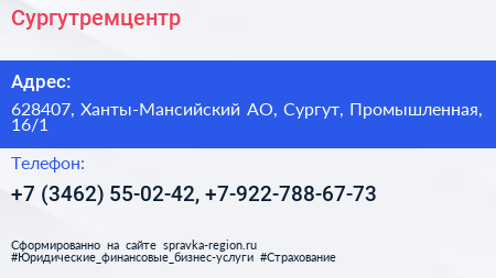 Сургутремцентр по адресу 628407, Ханты-Мансийский АО, Сургут, Промышленная, 16/1 в дальнейшем Организация, размещена в следующих категориях: