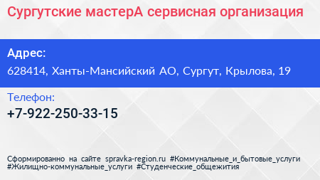Сургутские мастерА, сервисная организация по адресу 628414, Ханты-Мансийский АО, Сургут, Крылова, 19 в дальнейшем Организация, размещена в следующих категориях: