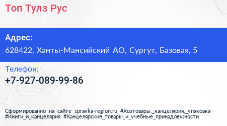 Топ Тулз Рус по адресу 628422, Ханты-Мансийский АО, Сургут, Базовая, 5 в дальнейшем Организация, размещена в следующих категориях: