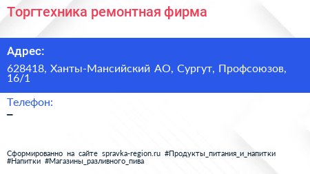 Торгтехника, ремонтная фирма по адресу 628418, Ханты-Мансийский АО, Сургут, Профсоюзов, 16/1 в дальнейшем Организация, размещена в следующих категориях: