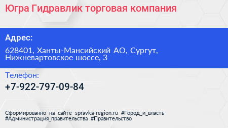 Югра Гидравлик, торговая компания по адресу 628401, Ханты-Мансийский АО, Сургут, Нижневартовское шоссе, 3 в дальнейшем Организация, размещена в следующих категориях:
