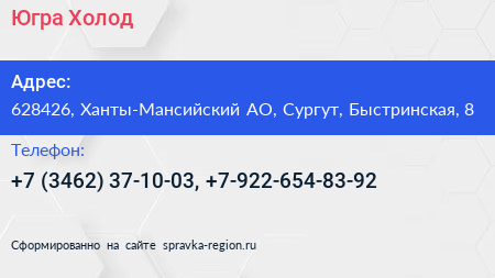 Югра-Холод по адресу 628426, Ханты-Мансийский АО, Сургут, Быстринская, 8 в дальнейшем Организация, размещена в следующих категориях: