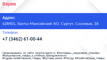 Вариа по адресу 628401, Ханты-Мансийский АО, Сургут, Сосновая, 18 в дальнейшем Организация, размещена в следующих категориях: