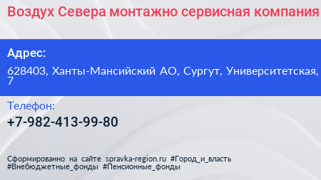 Воздух Севера, монтажно-сервисная компания по адресу 628403, Ханты-Мансийский АО, Сургут, Университетская, 7 в дальнейшем Организация, размещена в следующих категориях: