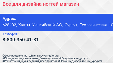 Все для дизайна ногтей, магазин по адресу 628402, Ханты-Мансийский АО, Сургут, Геологическая, 10 в дальнейшем Организация, размещена в следующих категориях: