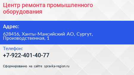 Центр ремонта промышленного оборудования по адресу 628416, Ханты-Мансийский АО, Сургут, Производственная, 1 в дальнейшем Организация, размещена в следующих категориях: