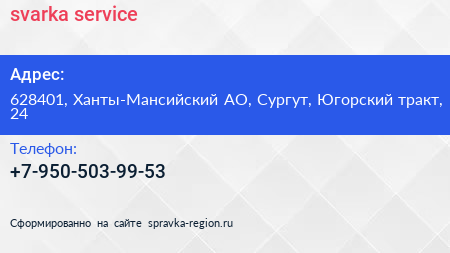 svarka-service по адресу 628401, Ханты-Мансийский АО, Сургут, Югорский тракт, 24 в дальнейшем Организация, размещена в следующих категориях: