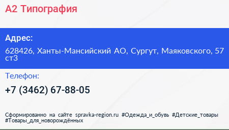 А2 Типография по адресу 628426, Ханты-Мансийский АО, Сургут, Маяковского, 57 ст3 в дальнейшем Организация, размещена в следующих категориях: