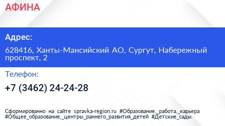 АФИНА по адресу 628416, Ханты-Мансийский АО, Сургут, Набережный проспект, 2 в дальнейшем Организация, размещена в следующих категориях: