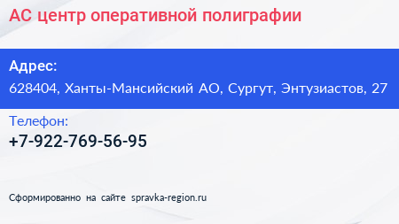 АС, центр оперативной полиграфии по адресу 628404, Ханты-Мансийский АО, Сургут, Энтузиастов, 27 в дальнейшем Организация, размещена в следующих категориях: