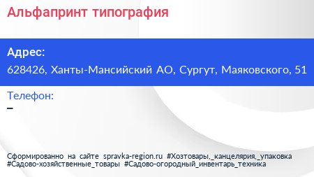 Альфапринт, типография по адресу 628426, Ханты-Мансийский АО, Сургут, Маяковского, 51 в дальнейшем Организация, размещена в следующих категориях:
