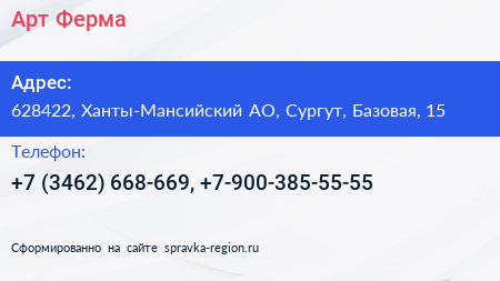 Арт-Ферма по адресу 628422, Ханты-Мансийский АО, Сургут, Базовая, 15 в дальнейшем Организация, размещена в следующих категориях: