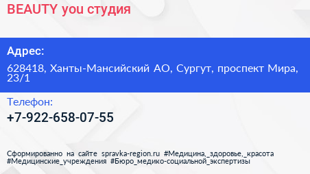 BEAUTY you, студия по адресу 628418, Ханты-Мансийский АО, Сургут, проспект Мира, 23/1 в дальнейшем Организация, размещена в следующих категориях: