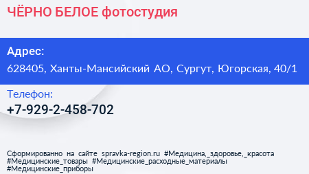 ЧЁРНО-БЕЛОЕ, фотостудия по адресу 628405, Ханты-Мансийский АО, Сургут, Югорская, 40/1 в дальнейшем Организация, размещена в следующих категориях: