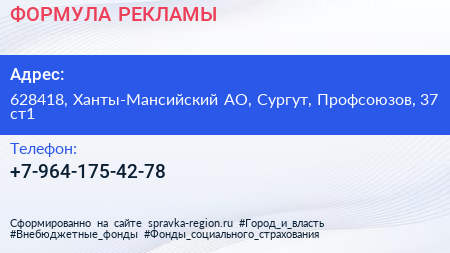 ФОРМУЛА РЕКЛАМЫ по адресу 628418, Ханты-Мансийский АО, Сургут, Профсоюзов, 37 ст1 в дальнейшем Организация, размещена в следующих категориях: