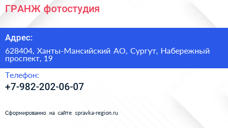 ГРАНЖ, фотостудия по адресу 628404, Ханты-Мансийский АО, Сургут, Набережный проспект, 19 в дальнейшем Организация, размещена в следующих категориях: