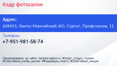 Кадр, фотосалон по адресу 628415, Ханты-Мансийский АО, Сургут, Профсоюзов, 11 в дальнейшем Организация, размещена в следующих категориях: